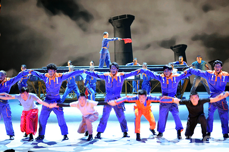 這是班戈縣諧欽民間藝術(shù)團(tuán)的年輕舞蹈演員,在北京華北電力大學(xué)禮堂彩排劇中修筑青藏鐵路的場(chǎng)景(唐召明2015年9月28日攝)