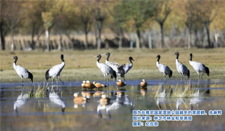 雅尼濕地生態(tài)的改善,不僅解決了困擾當(dāng)?shù)厝罕姸嗄甑娘L(fēng)沙問題,而且其高原濕地獨特的壯美景觀吸引了大批慕名而來的游客。這里已成為著名的林芝桃花的最佳觀賞地之一,尤其是黑頸鶴在此停留之時,正是桃花盛開之際,灼灼其華間清啼入云,桃紅緋然間鶴舞翩躚的勝景是大自然對這里的人們矢志保護生態(tài)的回饋,更是整個西藏自治區(qū)著力生態(tài)保護成效的縮影。