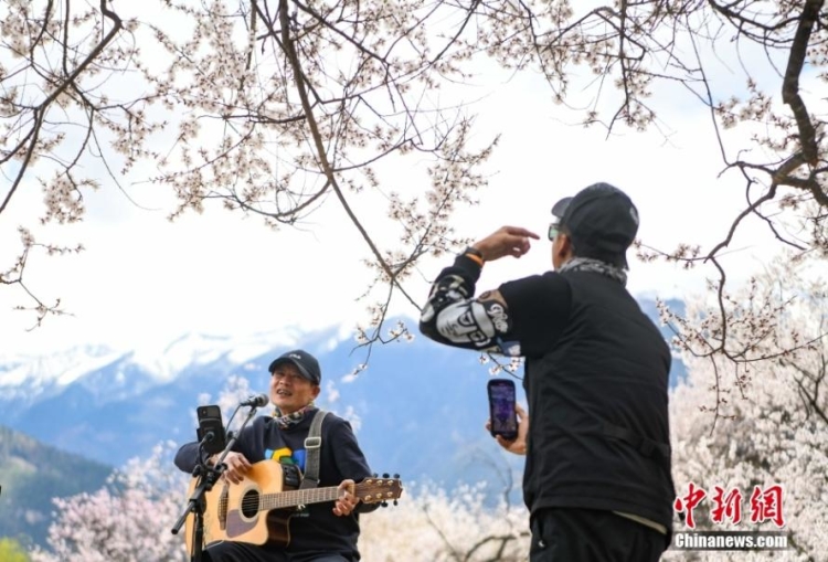 游客在嘎拉村桃樹下唱歌 中新社 貢嘎來(lái)松/攝