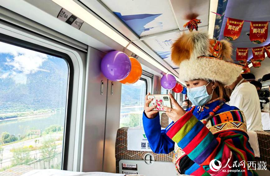 圖為拉林鐵路開通一周年,游客用手機(jī)拍下沿途風(fēng)景。人民網(wǎng) 李海霞/攝
