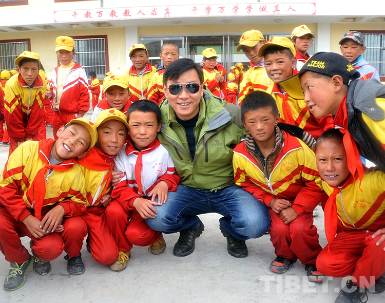 這是王飛在看望中國石化班戈縣小學的藏族孩子時合影留念(唐召明提供,2013年8月30日攝)