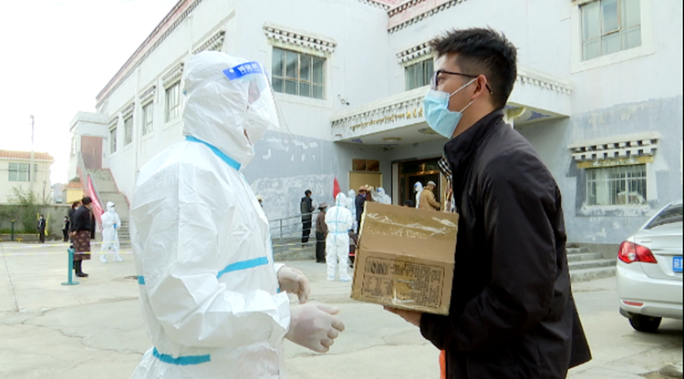 圖為阿里地區(qū)噶爾縣獅泉河鎮(zhèn)“五餡包”餐飲店工作人員把愛心早餐送到抗疫一線工作人員手中