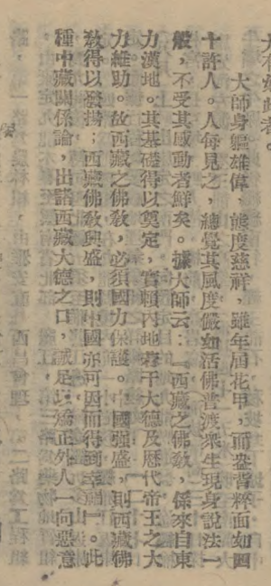 次年,應重慶漢藏教理院和成都佛學社的邀請,東本格西決定前往當地講法。期間,日本空襲不斷,拉薩官民與弟子因憂慮東本格西安危,力勸其勿前往。但是,東本格西從佛教利益世間的角度出發(fā),認為在當地民眾苦難之際,作為僧人更應不懼危險,前往當地慰藉民眾,以紓解戰(zhàn)爭造成的創(chuàng)傷與苦痛。1943年1月,東本格西從拉薩啟程前往理化(今理塘),參加九世班禪靈童尋訪測驗事宜。4月,經由康定抵達成都,沿途受到各地政府官員與僧俗弟子的歡迎。東本格西應中國邊疆問題研究會邀請講演“佛教與邊疆”,蒙藏委員會委員格桑澤仁翻譯。[3]講演內容主要分為三部分:首先,詳細敘述藏傳佛教發(fā)展演變的歷史,提出因于歷代高僧與中央政府的大力維護與資助,藏傳佛教發(fā)展的基礎才得以奠定;其次,分析邊疆佛教的分布與信仰狀況;最后,分析佛教與邊疆的關系。[4]他在講到佛教昌盛與國家實力發(fā)展之間的關系時,明確提出“西藏之佛教,必須國力保護,中國強盛,則藏傳佛教得以發(fā)揚,藏傳佛教興盛,則中國亦可因而得到幸?!盵5]。東本格西從歷史和現實角度詮釋西藏作為中華民族共同家園的角色,邊疆不惟具體的地理概念和信仰文化差異的標簽,而是中央政府長期支持發(fā)展的歷史凝結,是中華民族共同家園的一分子。