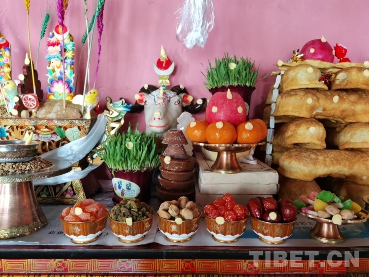 圖為藏歷新年期間擺放的切瑪盒等,其中盛放各類干果的酥油茶碗由中央代表團贈送 攝影:歐帆