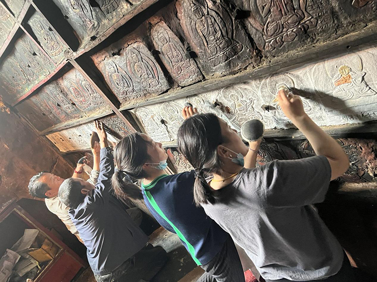 圖為日喀則市石刻藝術(shù)博物館工作人員開展石刻文物拓印工作 圖片來源:日喀則市文化局官網(wǎng)