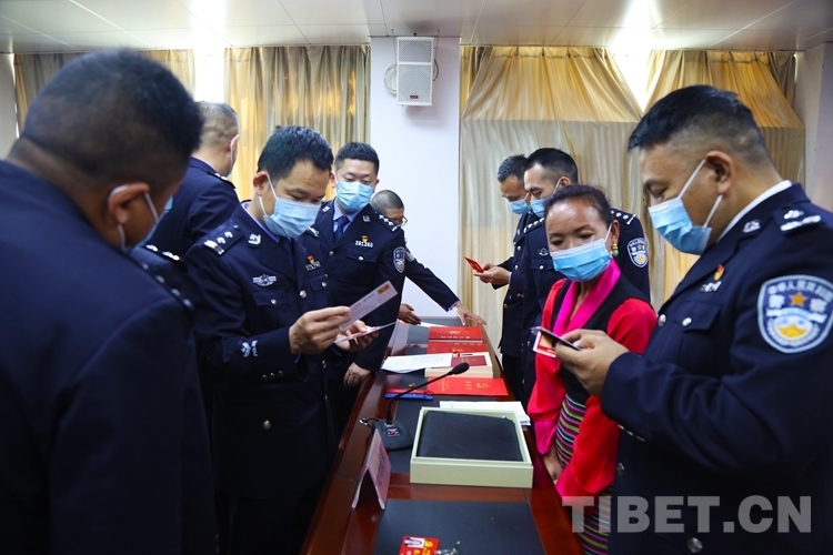 圖為尼瑪拉宗代表向民警展示參會(huì)物品 攝影:尼瑪?shù)┰?/p>