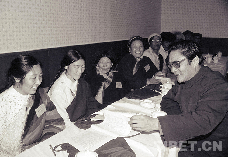 這是時任西藏自治區(qū)黨委副書記熱地(右)在與人大代表進(jìn)行交流。1988年1月15日至23日,西藏自治區(qū)第四屆人民代表大會第六次會議在拉薩召開(唐召明1988年攝)