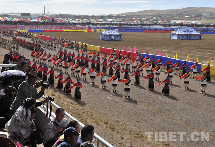 這是來自那曲地區(qū)(現(xiàn)那曲市)各縣代表隊(duì)在進(jìn)行入場式表演。當(dāng)日,那曲賽馬藝術(shù)節(jié)在藏北首府那曲鎮(zhèn)開幕(唐召明2013年8月10日攝)