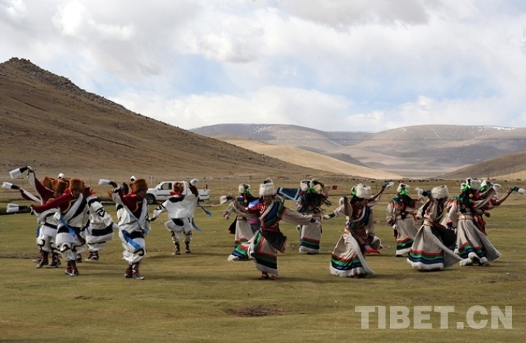 這是班戈縣諧欽民間藝術(shù)團(tuán)的年輕舞蹈演員,在家鄉(xiāng)草原跳起歡快的“鍋莊”舞(唐召明2015年5月21日攝)