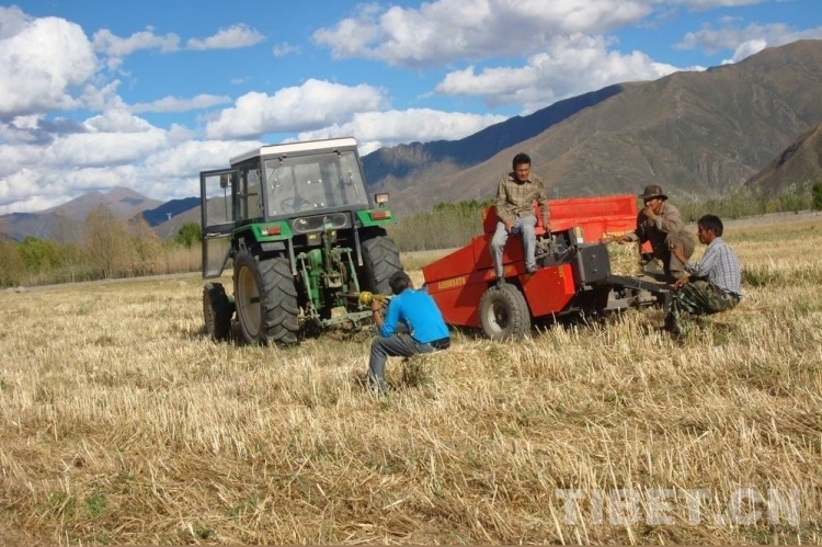 圖為西藏自治區(qū)農(nóng)牧科學(xué)院草業(yè)科學(xué)研究所科技人員正在開展飼用燕麥青干草打捆試驗(yàn)示范