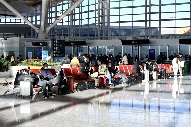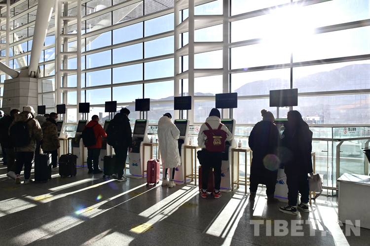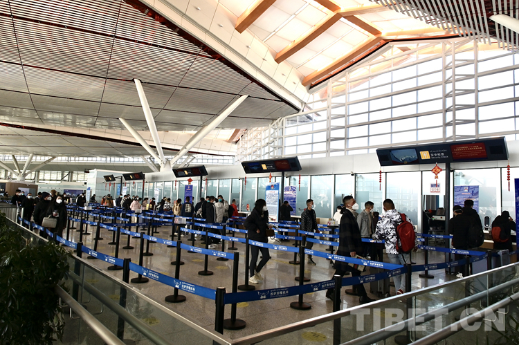 圖為春運首日拉薩貢嘎機(jī)場內(nèi)候機(jī)的旅客