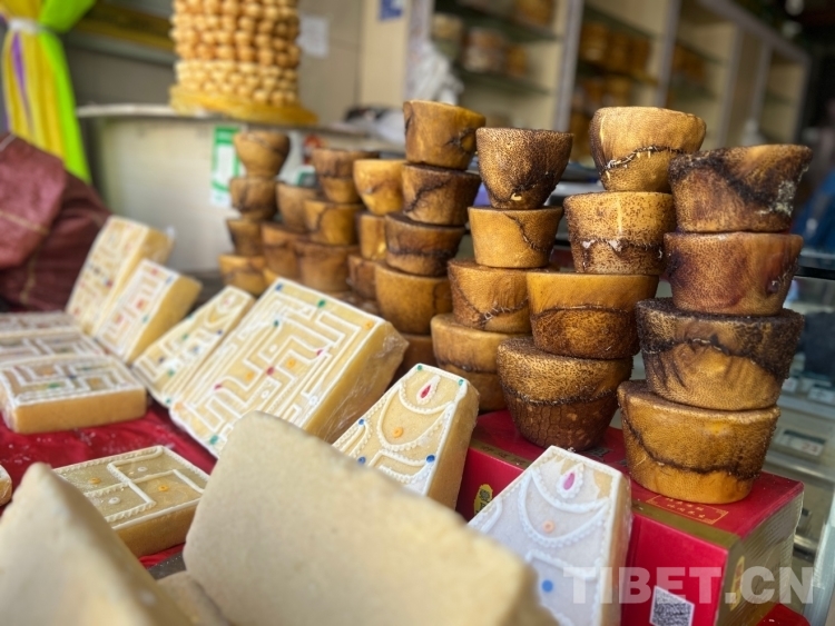 圖為年貨市場(chǎng)里的“退”(奶渣糕)和酥油 攝影:德吉卓瑪