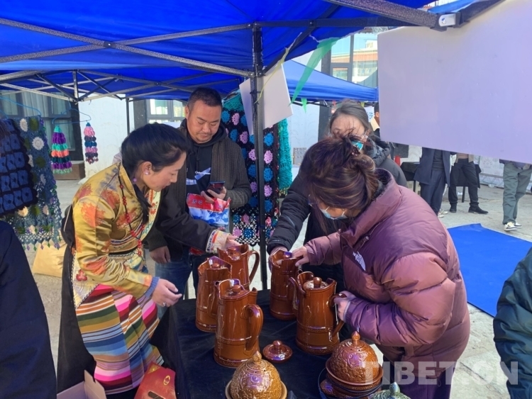 圖為“古院市集|年味拉薩”活動現(xiàn)場當(dāng)?shù)厥忻裨谕娌厥谨蛔印?/p>