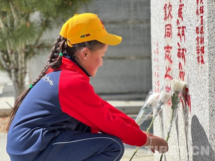 圖為西藏日喀則市昂仁縣多白鄉(xiāng)小學(xué)生為革命先烈敬獻(xiàn)鮮花 攝影:德吉卓瑪