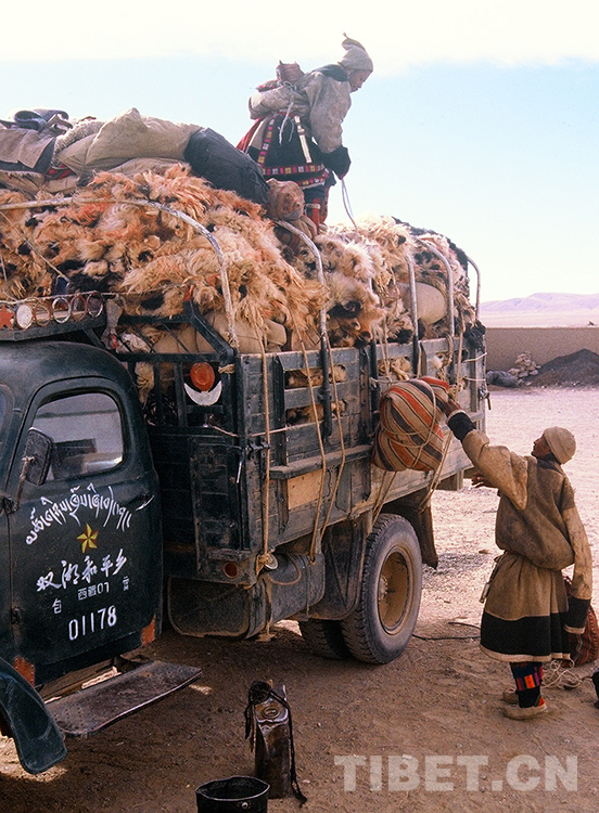 這是雙湖辦事處(現(xiàn)雙湖縣)和平鄉(xiāng)牧民正在裝車外運所交售的牛羊皮等畜產品(唐召明1987年攝)
