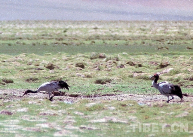 這是兩只漫步在藏北色林錯(cuò)國家級(jí)自然保護(hù)區(qū)的國家一級(jí)保護(hù)動(dòng)物、被稱為“鳥類熊貓”的黑頸鶴(唐召明2001年攝)