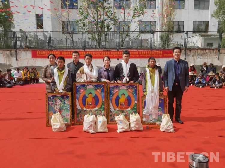 圖為學(xué)校為唐卡專業(yè)的學(xué)生贈(zèng)送自己的唐卡作品和繪畫工具及顏料等