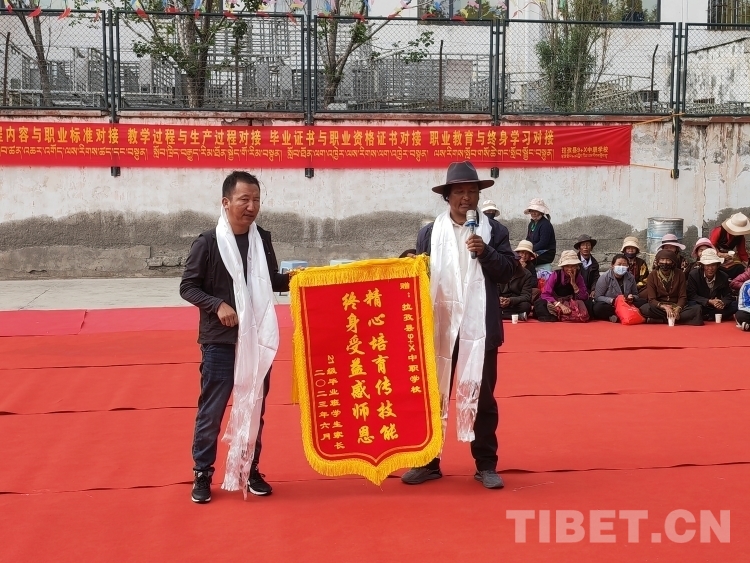 活動(dòng)現(xiàn)場(chǎng),學(xué)生家長(zhǎng)代表向?qū)W校贈(zèng)送錦旗并發(fā)表感言?!案兄x拉孜縣9+X中職學(xué)校培養(yǎng)了我的孩子,經(jīng)過學(xué)校的精心培養(yǎng),讓家人操碎心的孩子如今依靠從學(xué)校學(xué)到的技藝找到了一份滿意的工作,這讓我一家人感到很欣慰。”學(xué)生家長(zhǎng)代表白瑪有感而發(fā),“希望在場(chǎng)的孩子們也通過發(fā)揮自己的優(yōu)勢(shì),在社會(huì)上找到一份心儀的工作,同時(shí)真心祝福學(xué)校越辦越好?!?/p>