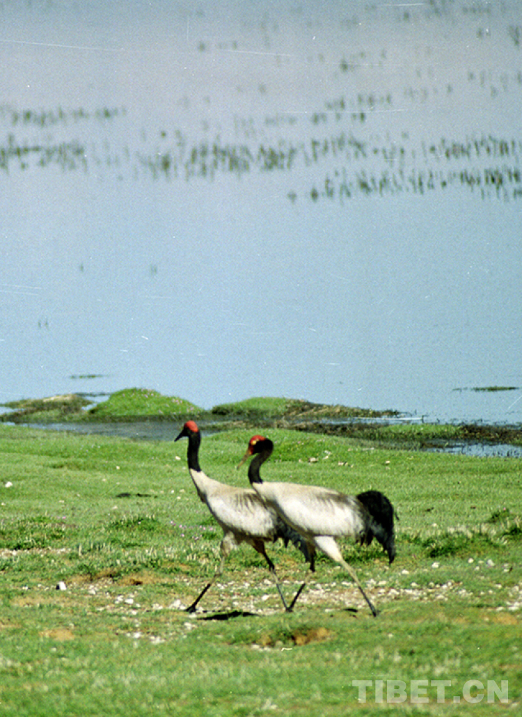 在藏北草原上漫步的國家一級保護動物、被稱為”鳥類熊貓“的黑頸鶴(唐召明2001年攝)