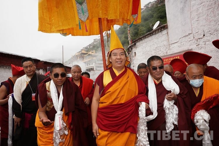 當(dāng)日11時(shí)許,在眾僧的期盼中,班禪一行抵達(dá)直孔替寺。頓時(shí),現(xiàn)場法號(hào)齊鳴、法螺合奏,直孔瓊倉·洛桑強(qiáng)巴活佛和僧眾在寺廟前舉行了隆重的歡迎儀式。