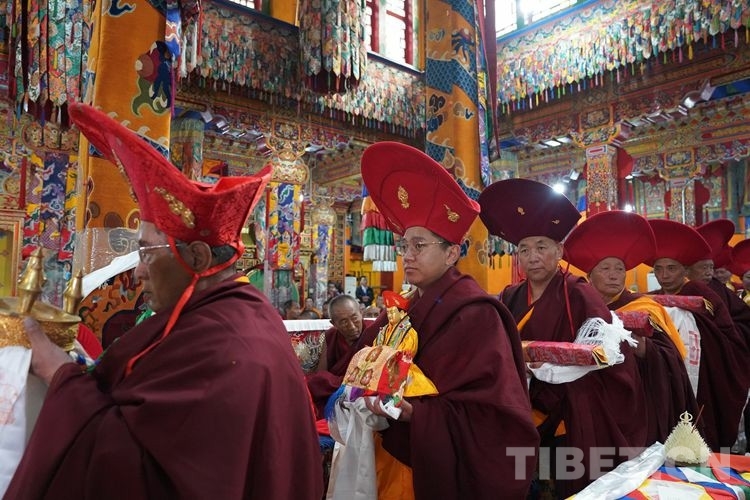 圖為在僧眾簇?fù)硐掳喽U緩步走向措欽大殿 攝影:王淑