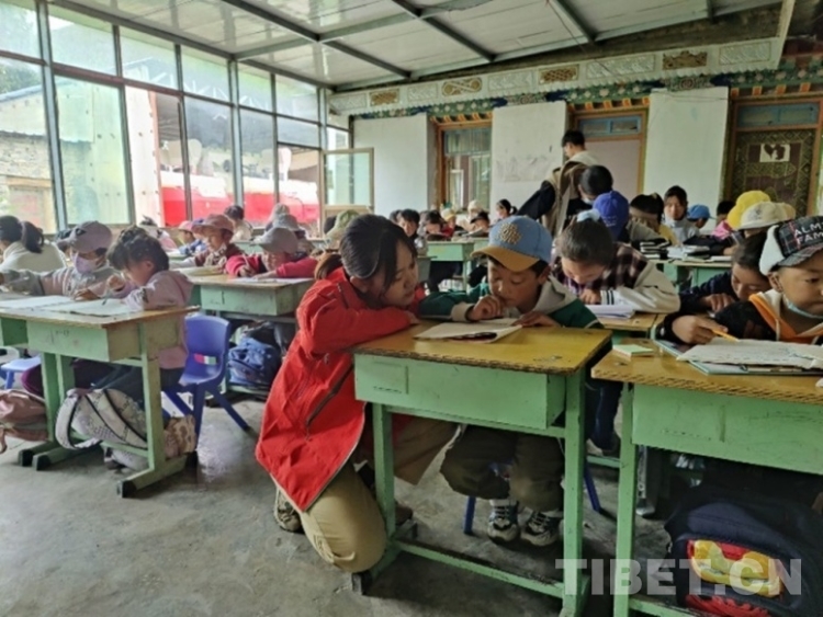 圖為人文科考隊員輔導孩子做作業(yè)