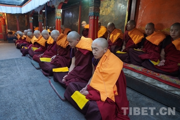 當天清晨,扎什倫布寺桑煙繚繞、法號聲聲,28 位受戒的年輕僧人帶著新制袈裟,迎著朝霞依次走向拉讓殿等待班禪授戒這一神圣時刻的到來。8時許,在手持黃傘、香爐和吹嗩吶的高僧護送引領(lǐng)下班禪緩緩步入拉讓殿,并與在場僧眾集體誦經(jīng)。誦經(jīng)儀式結(jié)束后,班禪就坐于拉讓殿寶座,4名高僧大德作為授戒眾,開始為僧人閉門授戒、剃度、賜法名、摸頂。此時,受戒僧人一一入座,兩手在胸前交叉,聽班禪引證經(jīng)典告誡,并宣誓嚴守戒律。