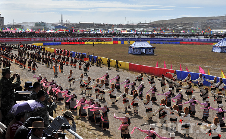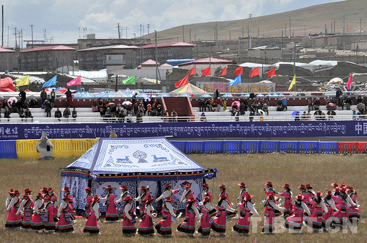 在新改建的那曲賽馬場一角的歌舞表演。當日,那曲賽馬節(jié)在藏北首府那曲鎮(zhèn)開幕(唐召明2013年8月10日攝)