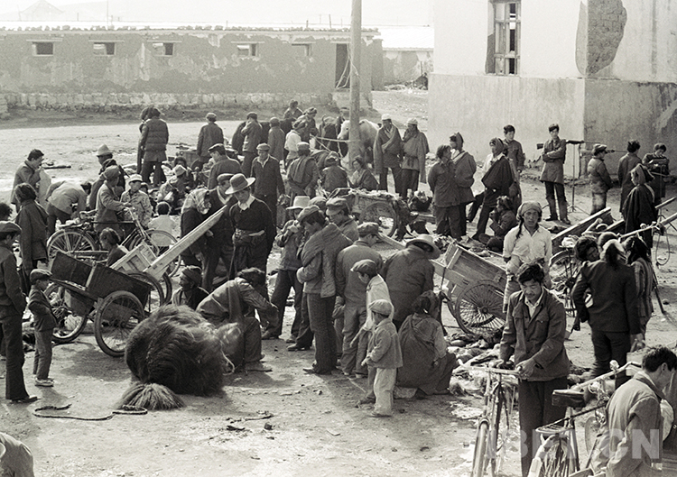 昔日那曲鎮(zhèn)露天市場,牧民群眾正在售賣現(xiàn)場宰殺的新鮮牦牛肉(唐召明1987年攝)
