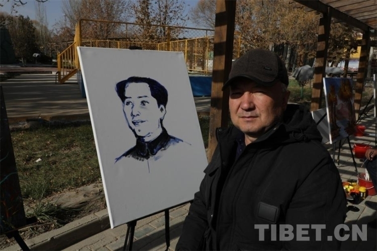 來到作畫區(qū)域,首先吸引記者注意的便是身穿黑衣、頭戴灰帽的西爾艾力·艾買提老人。在雪白的畫布前,老人用藍色和墨色顏料深淺描繪,勾勒出我們最熟悉的面孔。他向我們介紹說:“我畫的是我們偉大的毛主席年輕時候。沒有毛主席,我們中國人的生活不是這個樣子的,我很感恩他。我畫毛主席就是想讓更多人看見,讓他的故事得到更好的緬懷?!?/span>