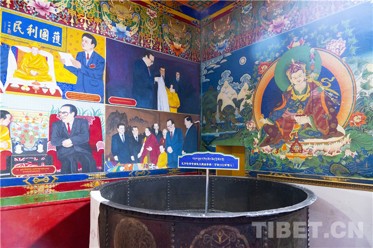 與寺廟內(nèi)傳統(tǒng)的佛教題材壁畫不同,在什倫布寺民族團結(jié)和愛國主義教育基地展廳北側(cè),繪制著十世班禪額爾德尼·確吉堅贊與歷代黨和國家領(lǐng)導(dǎo)人重要的會面時刻以及十一世班禪額爾德尼·確吉杰布金瓶掣簽的整個過程。