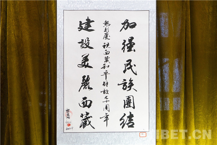 圖為扎什倫布寺僧人所書寫的“加強民族團結(jié) 建設(shè)美麗西藏”漢字書法 攝影:趙振宇