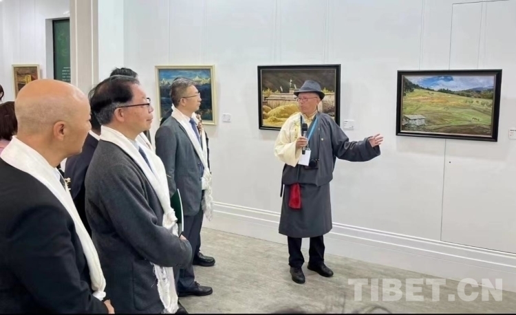圖為現(xiàn)場(chǎng)嘉賓參觀西藏油畫(huà)作品現(xiàn)場(chǎng)