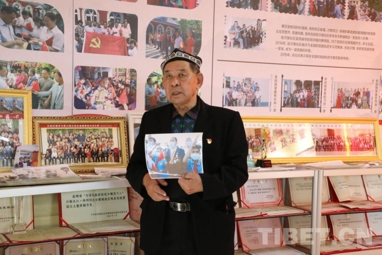 在講述故事的時(shí)候,沙勒克江·依明老人總是把腰背挺得直直的,雙眼的目光有神而堅(jiān)定,說(shuō)話(huà)吐詞帶有重音和落地實(shí)感。當(dāng)他拿起照片,講起自己觀看天安門(mén)廣場(chǎng)的升旗儀式時(shí),他會(huì)用腳一聲一聲地踏出聲音,沉浸描述當(dāng)時(shí)國(guó)旗班的腳步聲帶給他的心靈震撼。而隨著他的動(dòng)作,我們的身心也顫抖了起來(lái)。