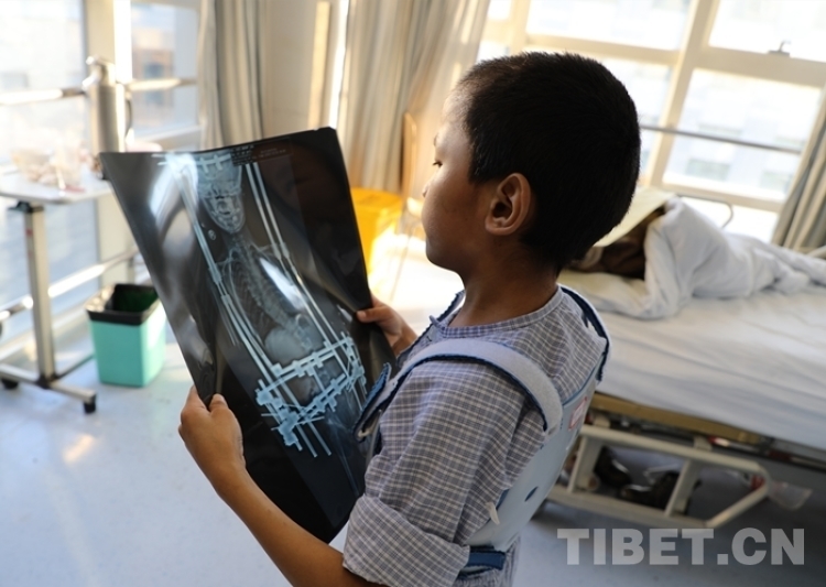 病房?jī)?nèi),9歲的扎西曲培已經(jīng)完成了手術(shù),在病房里奔走玩耍。他煞有介事地拿起自己的x光片,說(shuō)“這是我的,快治好的?!崩畲镜抡f(shuō),“這個(gè)小男孩調(diào)皮得很,天天很活躍,眼睛里都是機(jī)靈。剛來(lái)的時(shí)候他肩膀一個(gè)高一個(gè)低,肩胛骨也不對(duì)稱,如今走路的時(shí)候形態(tài)完全正常,身高長(zhǎng)了12公分,因?yàn)槟挲g小,將來(lái)恢復(fù)估計(jì)會(huì)更好一些?!?/p>