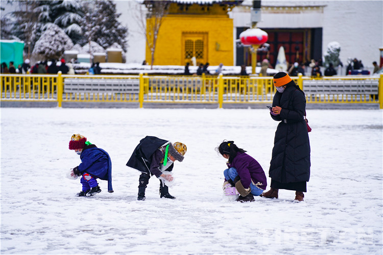 第四站,布達拉宮廣場?!敖o我一瓶礦泉水,我能還你兩座布達拉宮?!北绕鹗裁磿r候都可以在這里拍的布達拉宮倒影,雪中的布達拉宮廣場可謂是“可遇不可求”。南方的游客在這里激動地高喊“我終于見到雪了”,北方的游客抖抖肩膀上的雪花繼續(xù)拍攝下一組寫真,本地的藏族娃娃和小伙伴們一起追逐嬉戲,雪中的西藏和平解放紀念碑顯得更加巍峨。