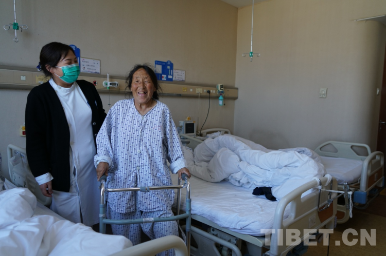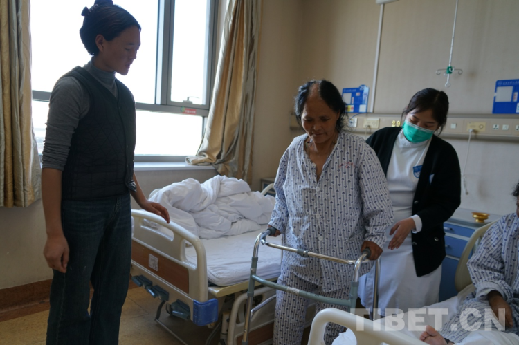 “卓瑪,你快給媽媽翻譯一下,用扶手架轉(zhuǎn)身的時候90度慢慢轉(zhuǎn),不要一次性轉(zhuǎn)180度,容易摔倒?!惫顷P(guān)節(jié)科護(hù)士薛小英從剛剛的驚慌中回過神來,對著29床病人布姆的女兒大聲叮囑道。就在剛才,這個來自洛隆縣59歲的右膝大骨節(jié)病患者布姆在骨關(guān)節(jié)手術(shù)24小時后,借助扶手架,在護(hù)士的指導(dǎo)下已經(jīng)能夠下床走路了。只是初次使用扶手架還不太熟悉,剛才180度的大轉(zhuǎn)彎讓一旁陪護(hù)的護(hù)士不禁捏了一把汗。女兒卓瑪聽到護(hù)士的話后趕忙告訴媽媽走路轉(zhuǎn)身要慢點,小心別摔倒。