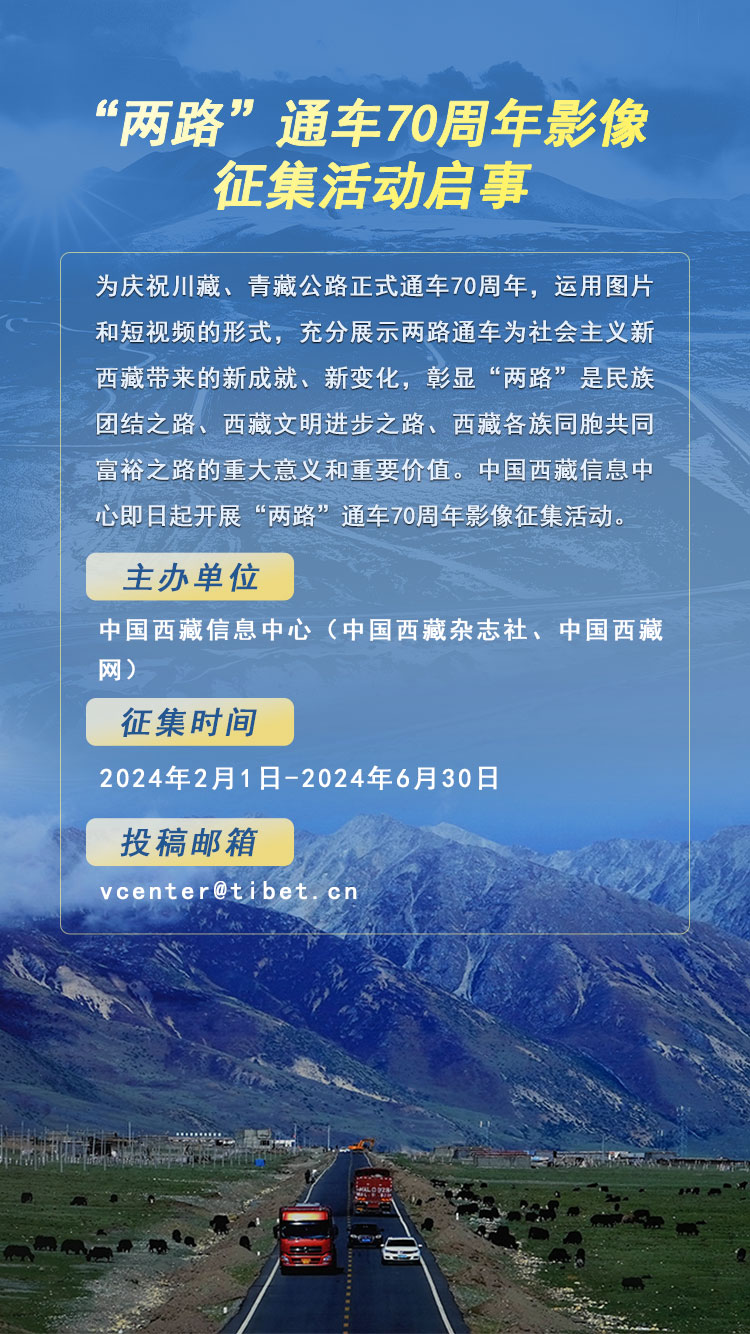 為慶祝川藏、青藏公路正式通車(chē)70周年,運(yùn)用圖片和短視頻的形式,充分展示兩路通車(chē)為社會(huì)主義新西藏帶來(lái)的新成就、新變化,彰顯“兩路”是民族團(tuán)結(jié)之路、西藏文明進(jìn)步之路、西藏各族同胞共同富裕之路的重大意義和重要價(jià)值。中國(guó)西藏信息中心即日起開(kāi)展“兩路”通車(chē)70周年影像征集活動(dòng)。