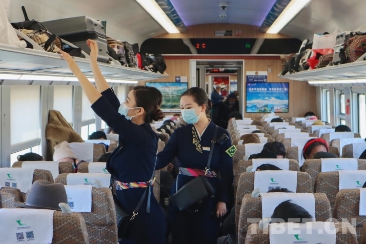 在拉日鐵路上的每一列高原動車組列車中,1名列車長,3名乘務員,要負責9節(jié)車廂,755名乘客的乘務工作。從上車查驗車票、行李安全擺放、列車禁煙宣傳,到途中協(xié)助乘客補票、提醒乘客到站信息等,列車乘務員們幾乎沒有時間休息。