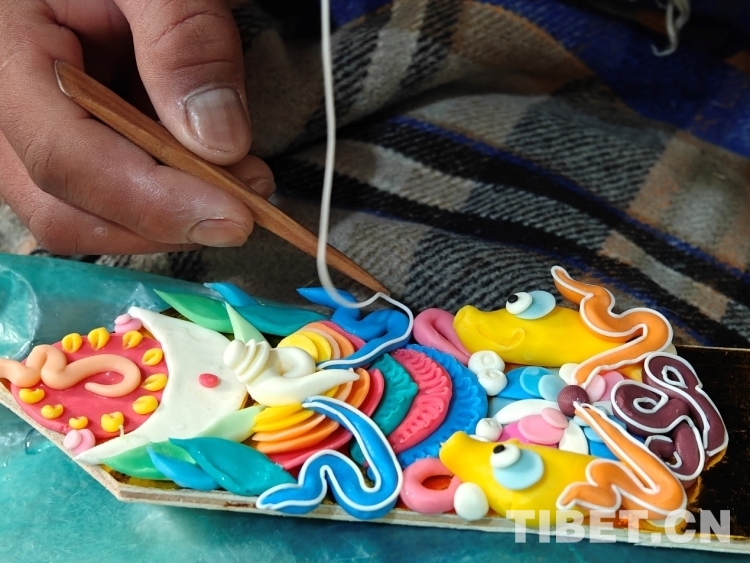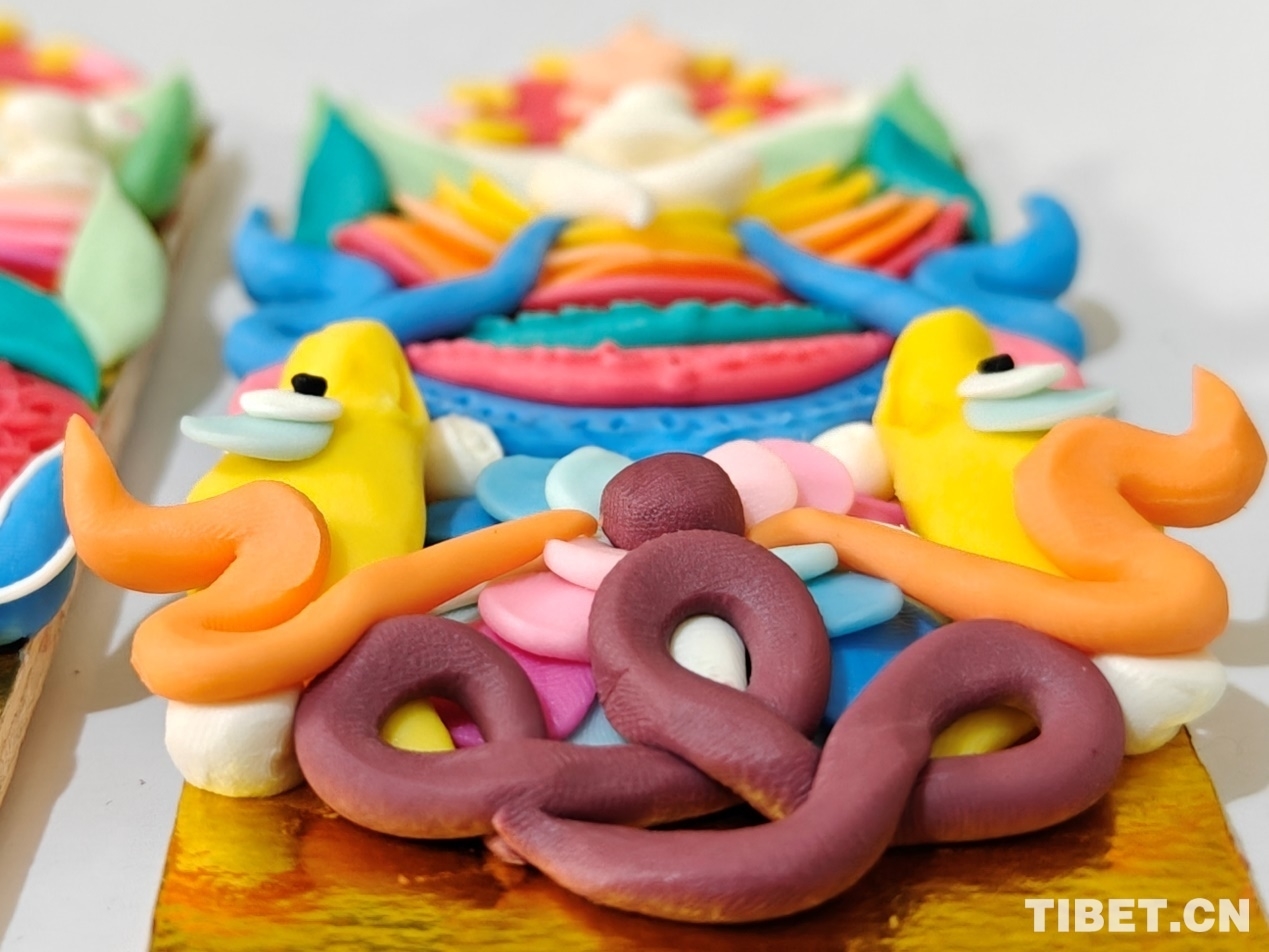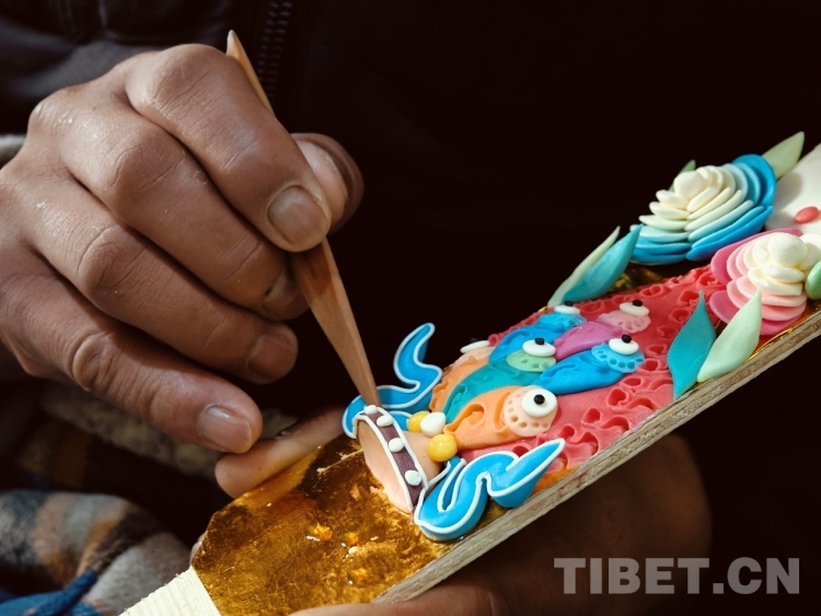 頓珠的二兒子丹增朗今年只有19是一名高中生,但制作酥油花的手法已經(jīng)極為嫻熟他盤腿而坐,面前擺放著調(diào)制好的各色酥油和一盆清水。只見他捏取一小塊酥油在冷水中浸泡一會(huì),然后熟練地用食指和拇指將酥油捏成不同形狀,粘貼于一塊盾形木板上,一對色彩斑斕、寓意吉祥的酥油花作品便完成了。