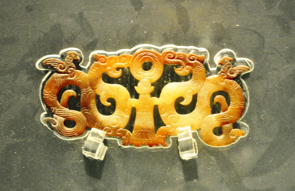 圖為湖北荊州出土楚國(guó)玉佩:二龍拱璧,載人升天,攝于荊州博物館,距今2400年
