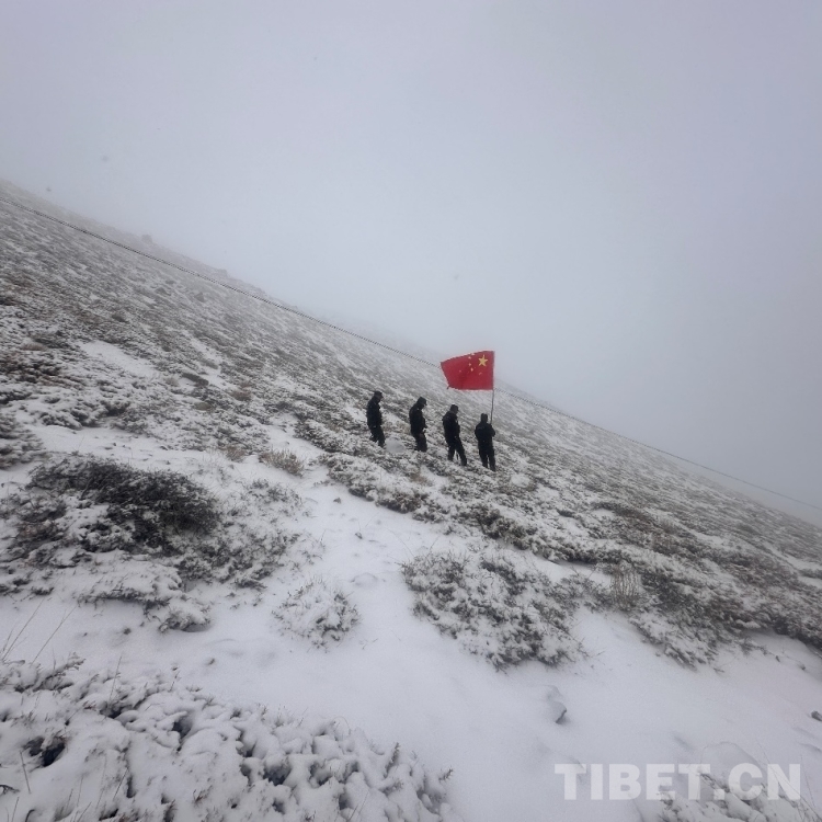 圖為斜爾瓦執(zhí)勤點(diǎn)民警冒著風(fēng)雪在中尼10號界樁旁巡邏踏查 攝影:格熱