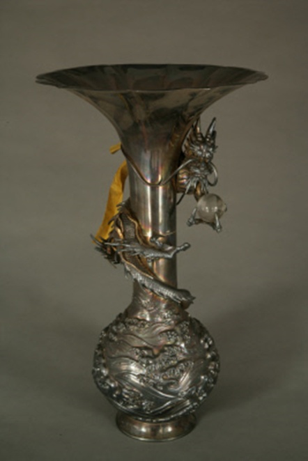 此款銀蟠龍紋花瓶,高39厘米,口徑22厘米,底徑9.5厘米。喇叭形口,長頸,球形腹,底有圈足。瓶身腹部捶鏨裝飾,翻騰的海水中浪花飛濺,一長龍從瓶頸基部躍出波濤,以圓雕形式大海盤旋而上,龍身纏繞瓶頸,龍首貼近喇叭形瓶口下,頭高昂,短粗的龍角豎立,伸出一龍爪擎一晶瑩剔透水晶球一枚。寓“龍戲珠”之意。銀瓶為一對,是宮中的貢品,寓意“雙龍戲珠”。每只花瓶皆附有黃條,其上墨書:“小村壽太郎進(jìn)”字樣。