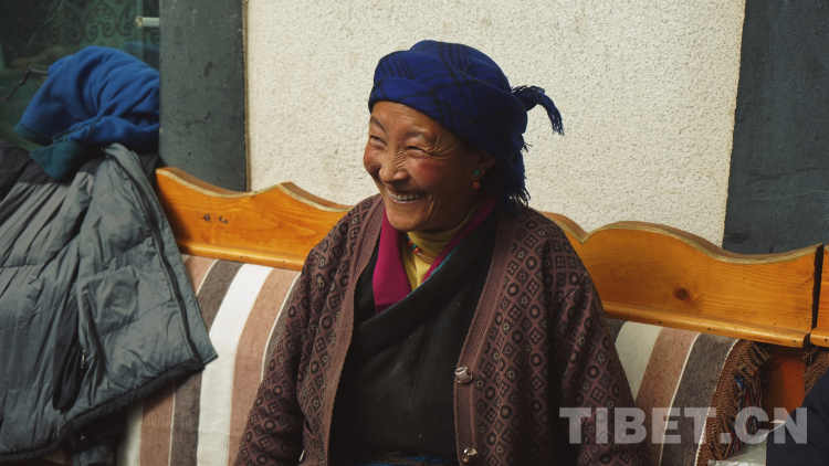 這是我最喜歡的莫啦。住在莫啦家的幾天里,除去采訪、收集素材和寫稿,最放松的時(shí)刻就是忙里偷閑和莫啦在廚房烤火、在巷子口曬太陽。莫啦會(huì)問我穿得這么少冷不冷,會(huì)給我講路過的小女孩有個(gè)雙胞胎姐姐,會(huì)讓我送熱水給我的同事喝,會(huì)拿盛滿卡塞和奶渣的點(diǎn)心盒塞給我吃,會(huì)在我想把手頭工作做完再吃飯時(shí)問同事我怎么不吃飯。當(dāng)然這些我大多是聽不懂的,有些是德瓊阿佳(莫啦的女兒,拉康社區(qū)婦女主任,同時(shí)也是客棧的老板)和達(dá)次哥(這次出差的司機(jī)師傅)翻譯給我的,有些是我倆通過比劃猜到的。