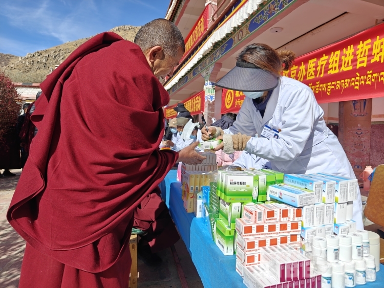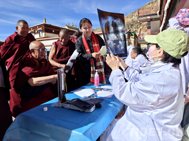 義診現(xiàn)場,醫(yī)療隊(duì)專家在翻譯的配合下,耐心地為每一位前來咨詢的僧眾及周邊民眾詳細(xì)問診、檢查,耐心地傾聽患者訴說病情,細(xì)致詢問患者的病史和用藥情況,對(duì)各自不同的病癥提出合理化的治療建議和健康指導(dǎo),并針對(duì)由于西藏獨(dú)特的自然環(huán)境和飲食習(xí)慣造成的高血脂、高血壓、高血糖、肺動(dòng)脈高壓、代謝性疾病和血管性疾病等高發(fā)病提供了專業(yè)建議和治療方案。