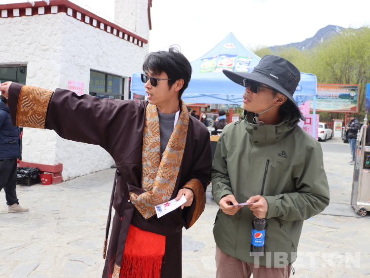 圖為林芝市職業(yè)技術(shù)學(xué)校學(xué)生在打卡點(diǎn)“次仁的家”服務(wù)游客