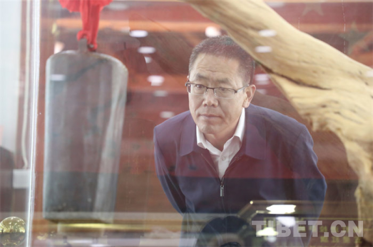 圖為莫河駝場(chǎng)青藏駝隊(duì)歷史陳列館館長(zhǎng)張存虎觀看西藏運(yùn)輸總隊(duì)頭駱駝鈴 攝影:王茜