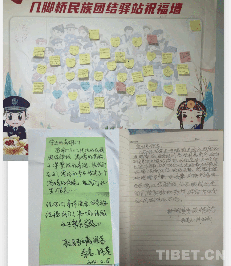 記者在社交媒體上也看到了很多游客以視頻、圖文等形式分享了他們和幾腳橋民族團(tuán)結(jié)驛站的故事?!耙?yàn)楫?dāng)?shù)靥厥庠蛭覀兊娇h城沒有地住了,在小紅書上看到這個(gè)驛站可以留宿,實(shí)在沒有辦法去邊防檢查站詢問。邊防小哥哥了解原因后特別暖心立馬給我們安排住宿,洗漱用品樣樣不差,太贊啦!這是我這一路旅行睡得最香的一晚,主要還免費(fèi)!”一位游客半調(diào)侃地分享了自己的故事,還加了三張夜拍驛站的圖片。一張用外景,在夜里,“幾腳橋民族團(tuán)結(jié)驛站”漢藏雙語大牌十分醒目;一張室內(nèi)環(huán)境,左右兩邊的上下鋪床上放著四個(gè)“豆腐塊”被子,床單潔白如新,中間的小桌子上還放著氧氣罐、雜志、臺燈等用品;一張貼滿祝福與感謝的“便簽墻”……張張圖片體現(xiàn)了驛站工作人員的用心良苦,也定格著他難忘的定結(jié)記憶。