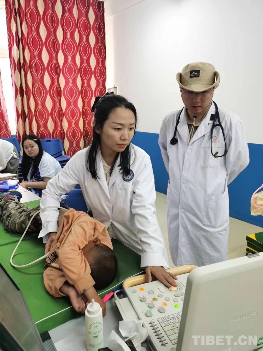 圖為醫(yī)療專家團(tuán)隊在給疑似先心病患兒做心臟超聲檢查 攝影:白瑪司郎