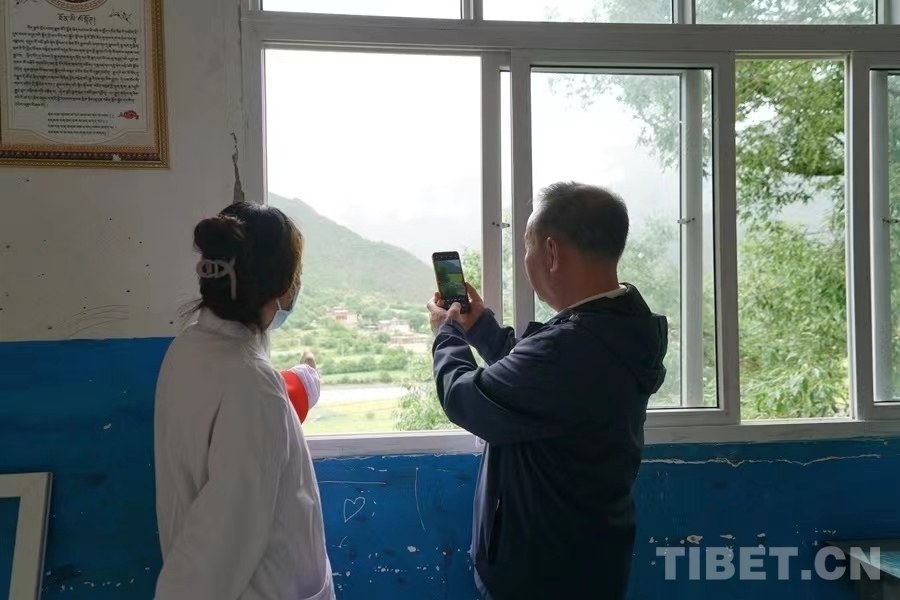 圖為上午義診結束后,四郎曲珍為魏希發(fā)介紹當?shù)氐娘L景 攝影:周晴晴